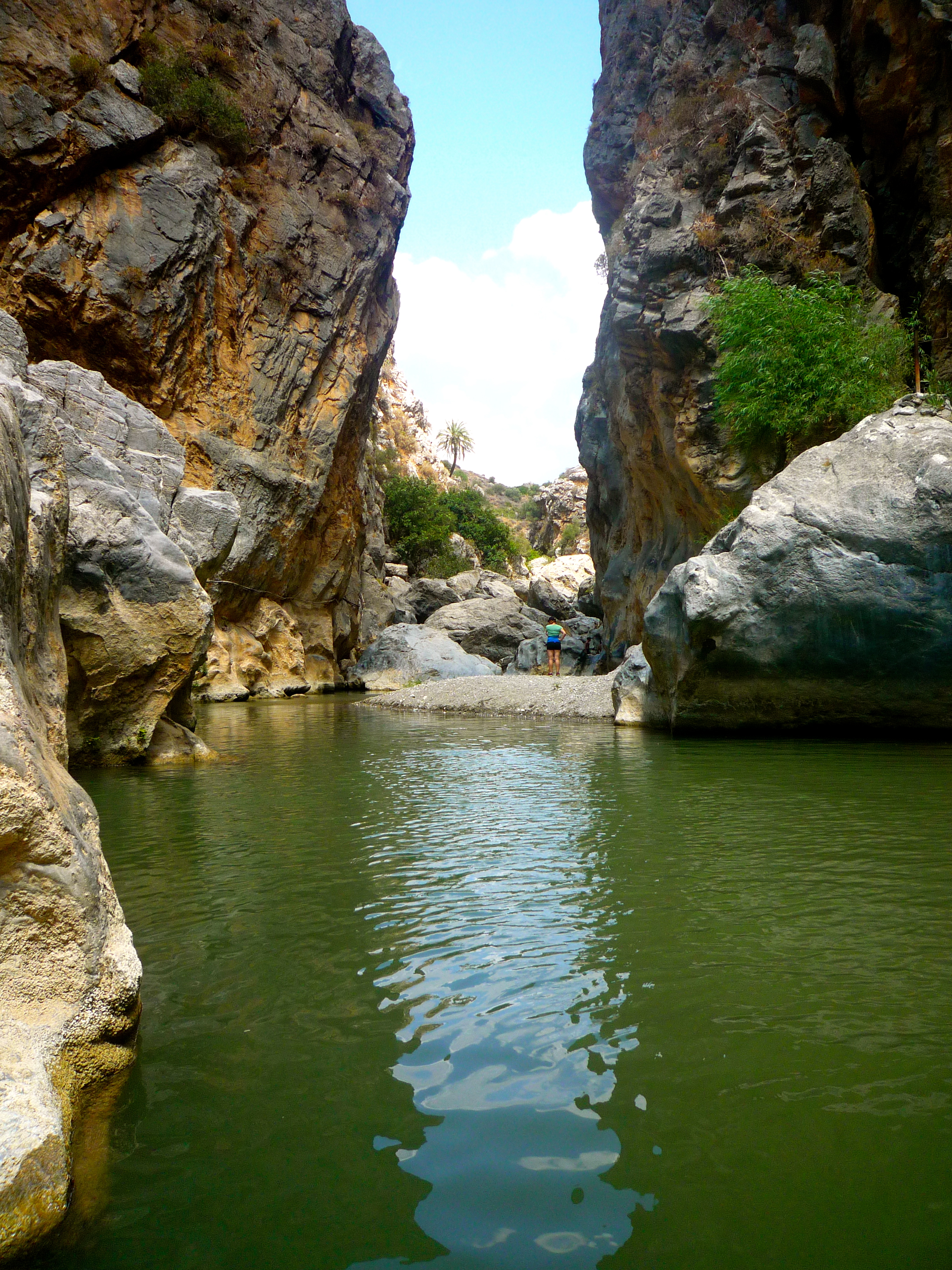 We climbed the rocks and swam across the pools like children. I tore my bikini bottoms on the rocks while sliding down a cascade of water and stone. Some of us disappeared up the gorge for well over half an hour, while others floated down among the little fish in the cold clear water. In the middle of the boulders and cascades we met a group of gray-haired German backpackers who had hiked down following the river, all the way from the spring up above. They were swimming with shoes and backpacks, tumbling down into the water from the boulders, cackling with laughter, and not fearing hurting themselves.